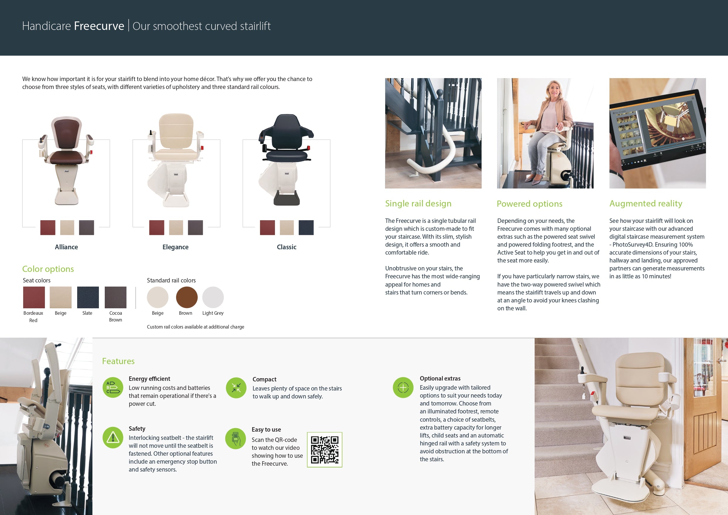 This attractive system has a tubular, single rail system that allows the curved stairlift to fit on the narrowest of stairs and navigate the tightest bends. The Freecurve is also uniquely customisable, allowing the stairlift to fit in with any home or décor.