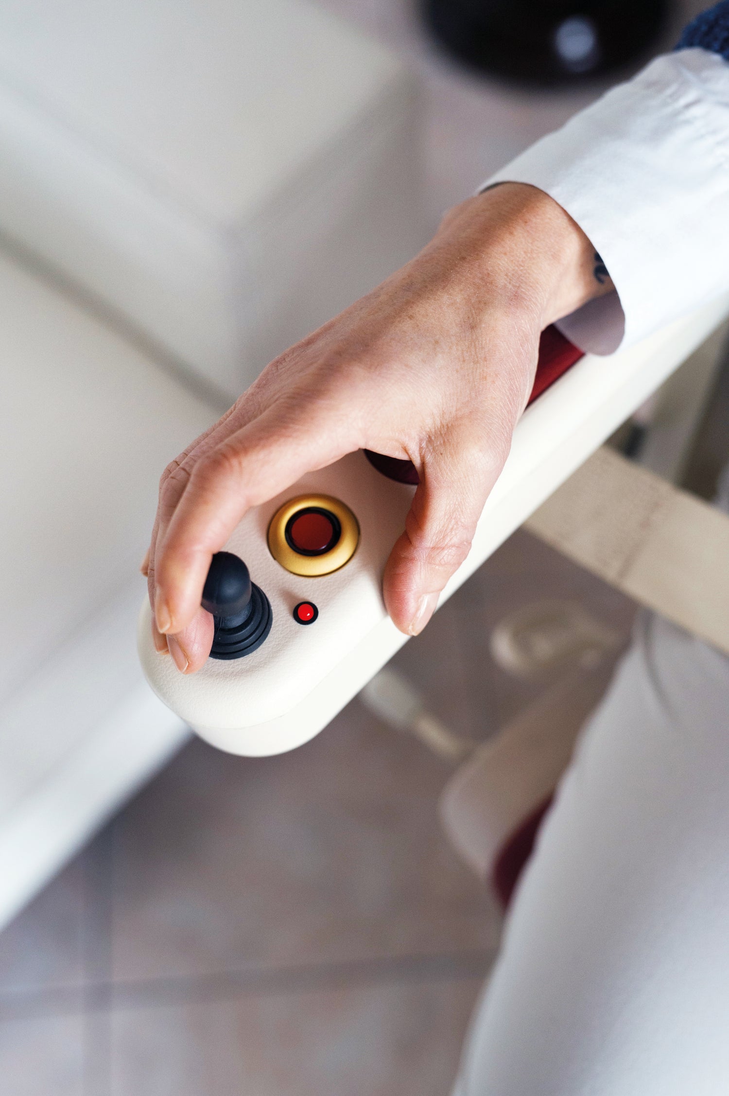 The Freecurve features a flexible joystick that is operable independent of a user's handicap and designed without obstructions for clothing. For safety, it acts as a "dead man's handle," meaning the chair lift stops automatically if the control is released. The joystick on the chair has priority over wall buttons, ensuring the user is always in control. This single control operates multiple functions, including the run of the lift, the folding hinge, and the optional powered swivel.